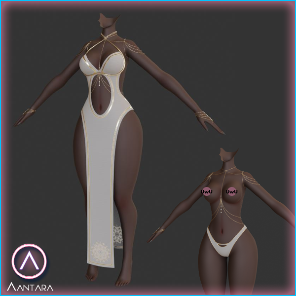White with gold detailing textures in 2k resolution. Metal pieces are a separate material for easier editing. Masks provided to change the color of the gold detailing on the dress.